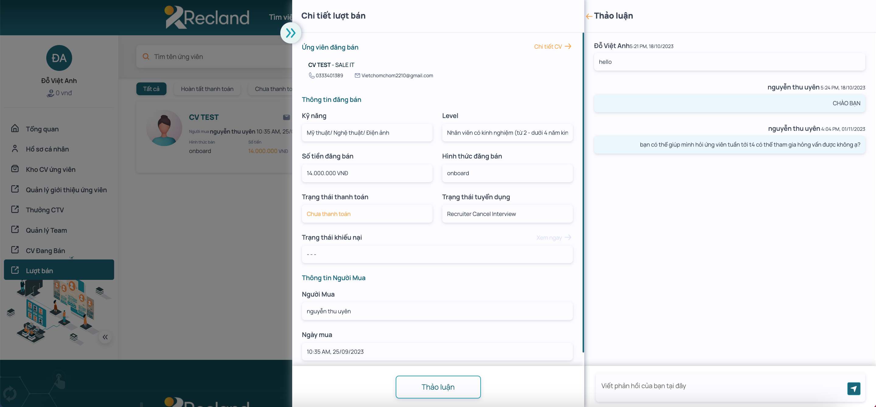 +) Thảo luận: Trao đổi thông tin, đặt lịch phỏng vấn, đặt lịch Onboard sau khi nhà tuyển dụng mở CV