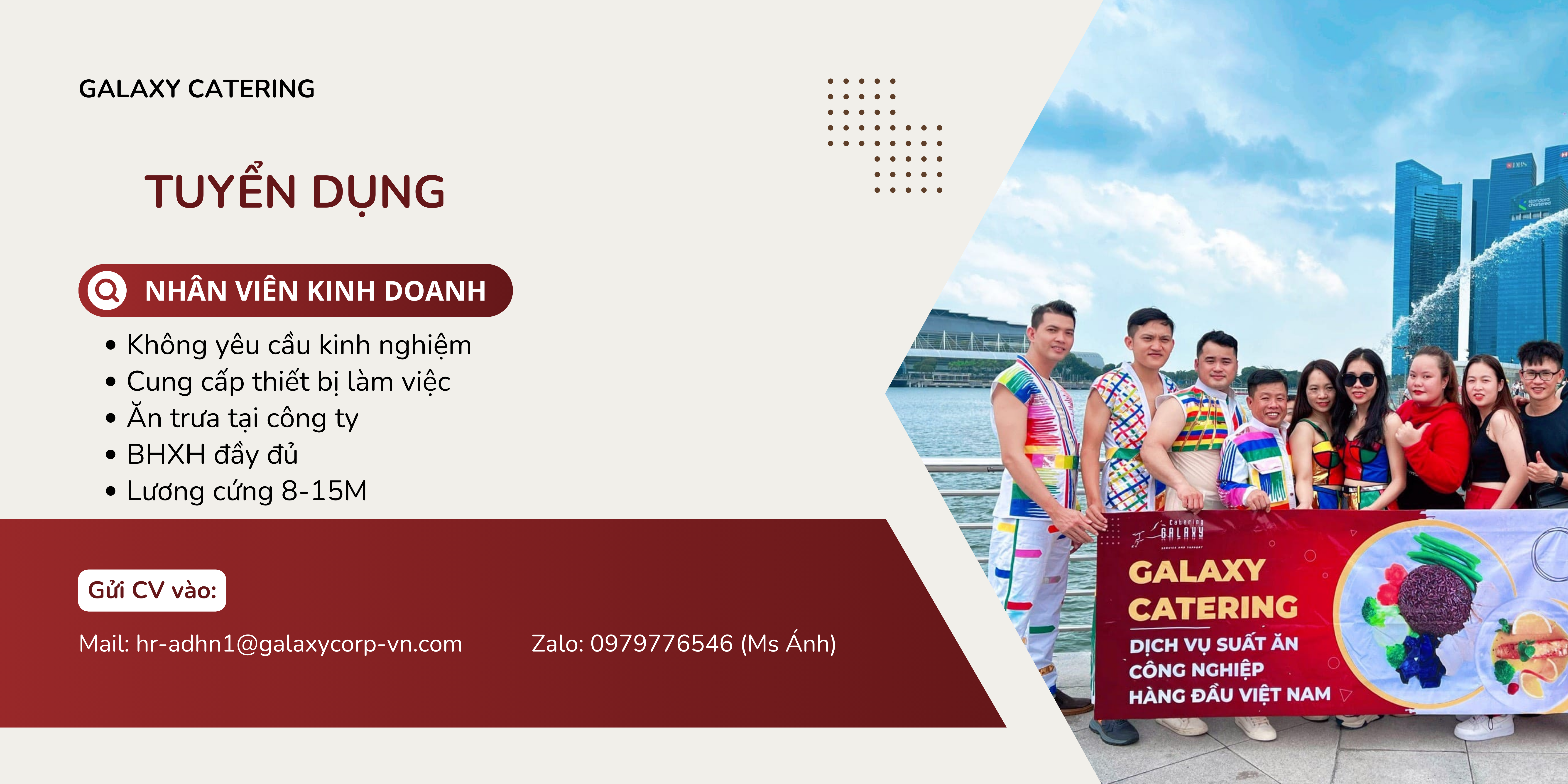 - Kinh nghiệm: Ưu tiên đã có kinh nghiệm làm trong lĩnh vực suất ăn công nghiệp hoặc Sales & marketing ngành dịch vụ ẩm thực, không có kinh nghiệm sẽ được đào tạo